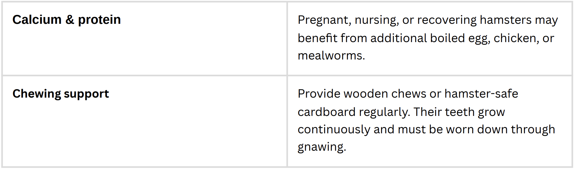 Most hamsters receive all necessary nutrients from a balanced seed mix and fresh foods. Supplementation is generally not required but can be considered in some situations