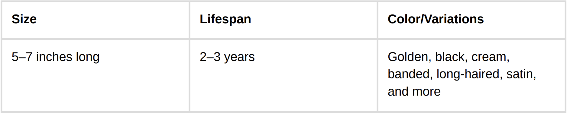 Syrian hamsters (also known as golden hamsters) are solitary, nocturnal rodents that make engaging pets when provided with proper housing, enrichment, and nutrition. Unlike dwarf hamsters, Syrians must be housed alone, as they are highly territorial and can fight if kept with others. Known for their gentle nature and variety of coat types and colors, they are a great choice for responsible older children and adults alike. Hamsters are small but complex animals with specific needs around space, bedding, diet, and daily activity. With the right care, Syrian hamsters can live a happy and healthy life in captivity.